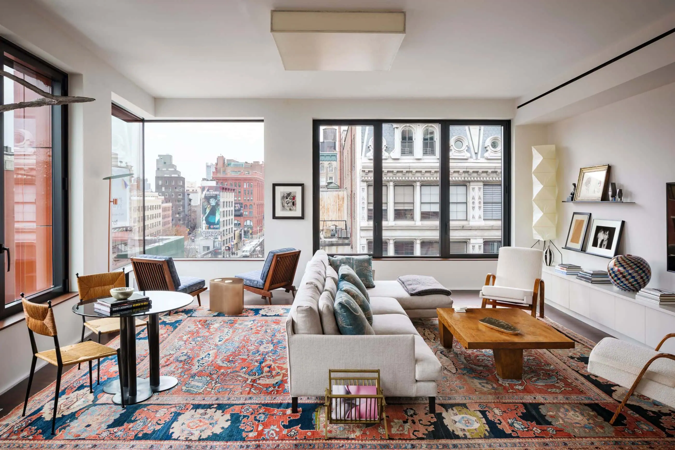 Located in a Selldorf-designed residential building in New York’s NoHo neighborhood, this two-bedroom apartment enjoys an open, loft-like layout with expansive windows of the historic neighborhood. The firm designed the welcoming and generous interior with a contemporary sensibility that incorporates modern and midcentury furniture. A large Persian rug complements the neutral-toned furniture organizing the living space. In the dining area, a large custom-designed Claudia Moreira Salles 18-seat table anchors the space and accommodates large gatherings. The composition of warm-hued fabrics and finishes is carried across the apartment through the dining area, office space, walk-in closets and bedrooms.