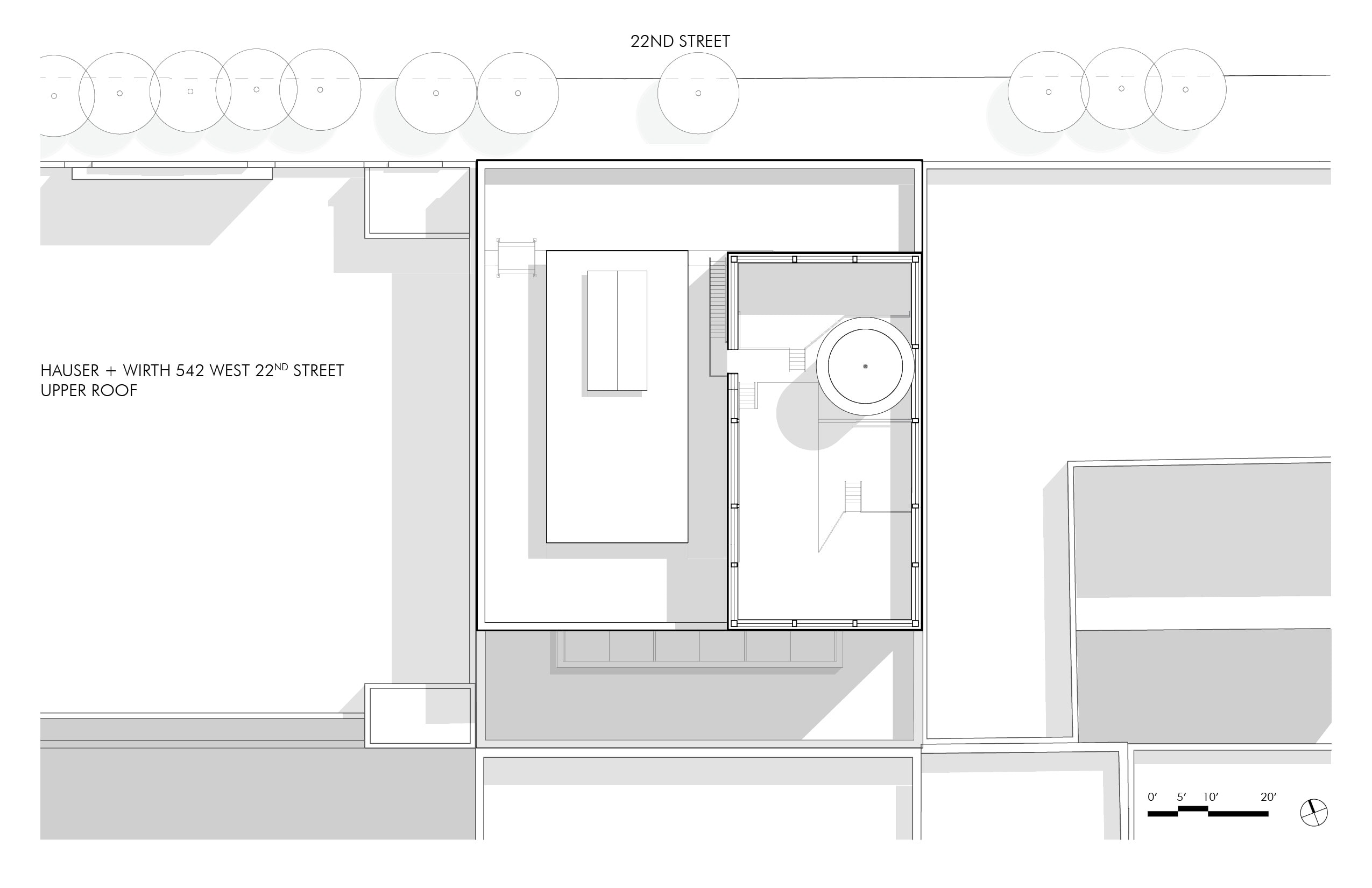To accommodate the exhibition of exceptionally large works of art, a 18-foot high, column-free and clerestoried gallery on the fifth floor has a large, glazed roof hatch that enables works to be craned into the building from the street. Here an expansively scaled ten-foot square picture window provides another sightline into and out of the gallery. In addition to exhibition space, the second floor includes a multi-purpose bar and event space, which will host artist talks and other public programs and gatherings. Private offices and showrooms occupy the third and fourth levels.