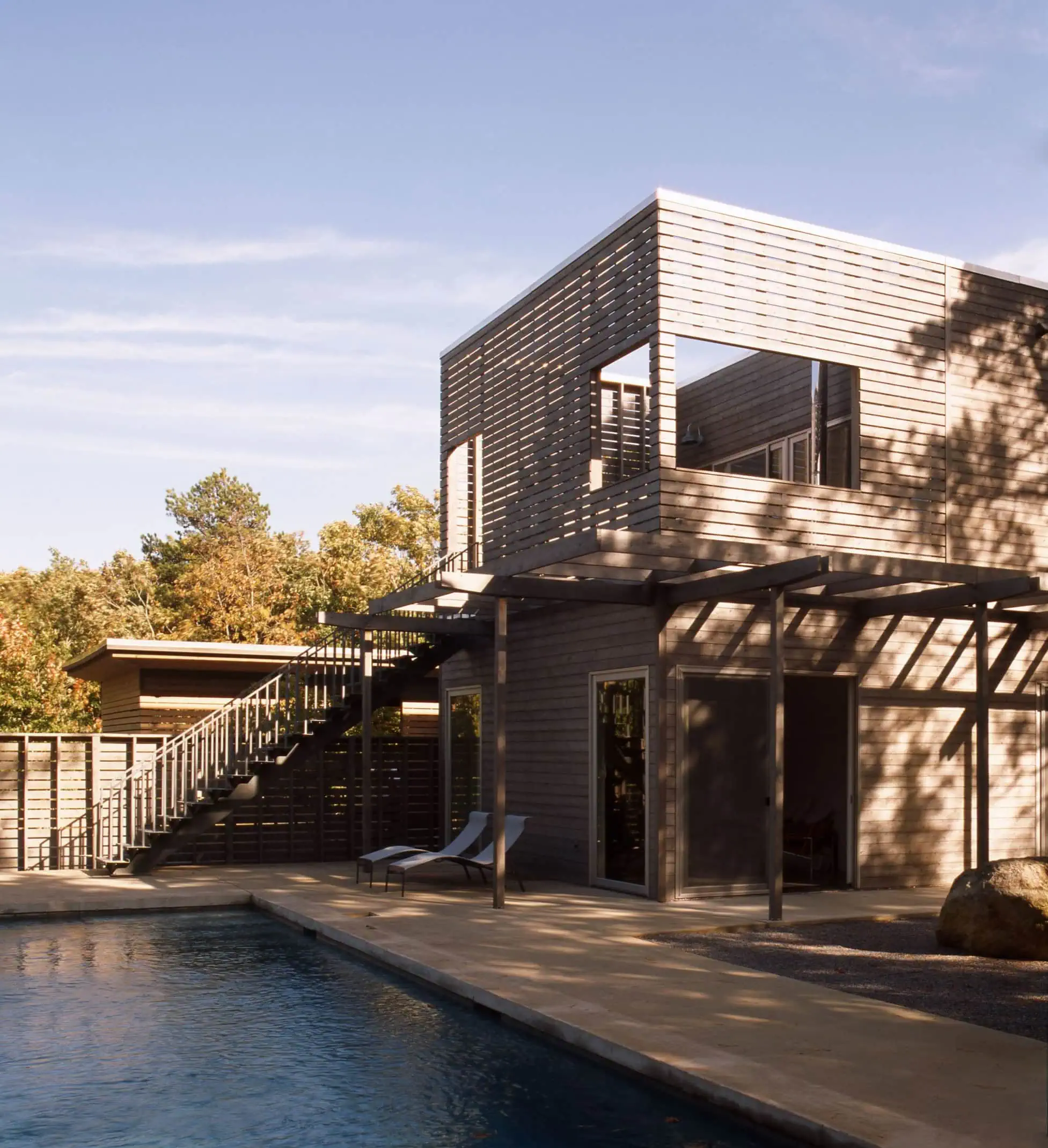 This 2,400 sf home was designed for a Manhattan couple who wanted an unpretentious weekend retreat. The plan divides the home into two separate wings: one wing for guests with its own separate entrance and another with living and dining areas for entertaining, which is topped by a master suite with private deck. The two wings of the home are separated by a bluestone-paved courtyard which is both gracious and intimate. The courtyard is complemented by other outdoor living spaces including a trellis-covered patio, terraces shaded by large overhangs, and an enclosed pool area.