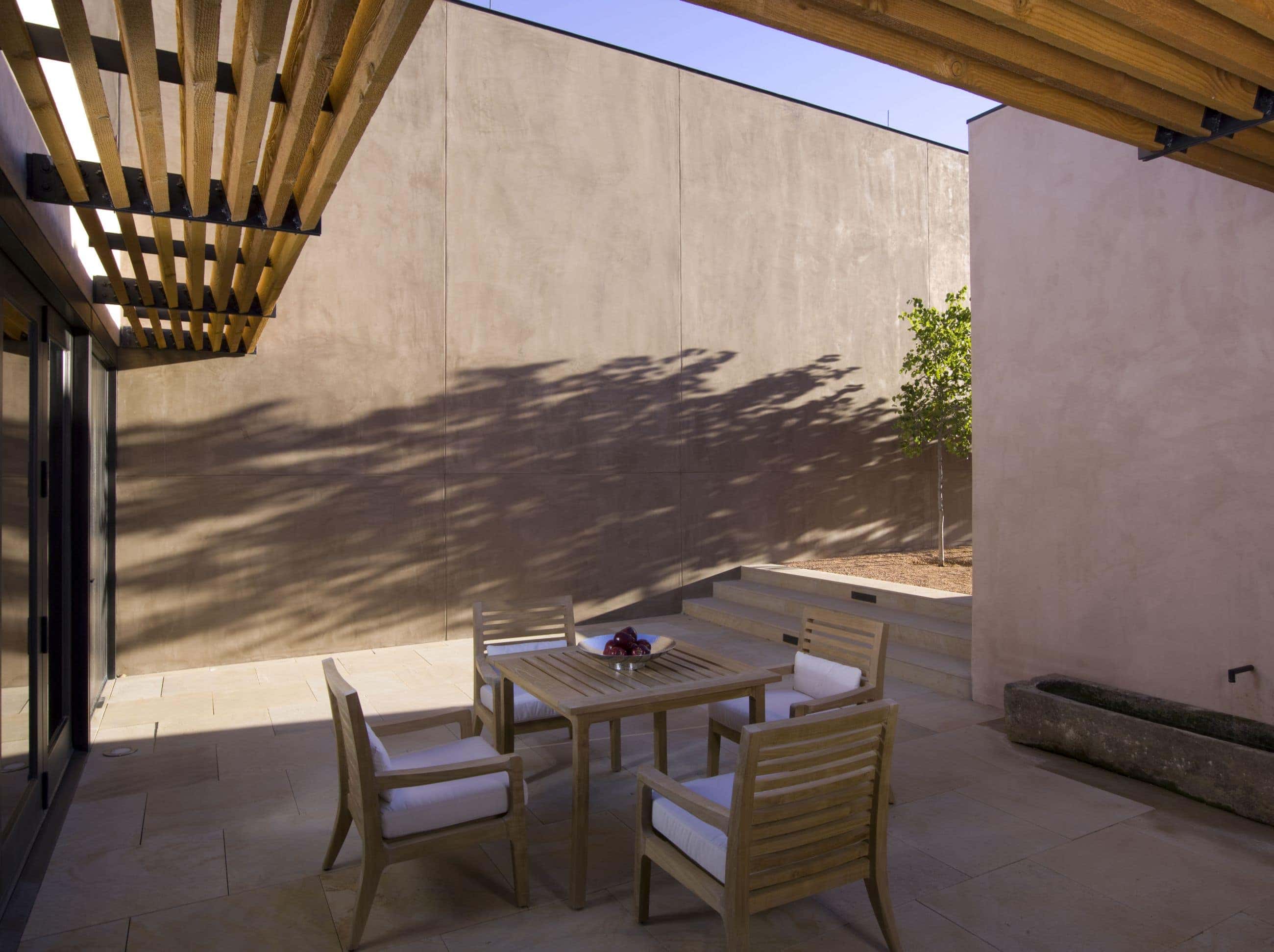 Each villa is organized around dramatic masonry walls and a shaded arrival court which define a series of airy, interconnected spaces. The living and dining spaces have sliding glass walls which open to a large pool and terrace. Villas have bedroom suites which open to private gardens or terraces.